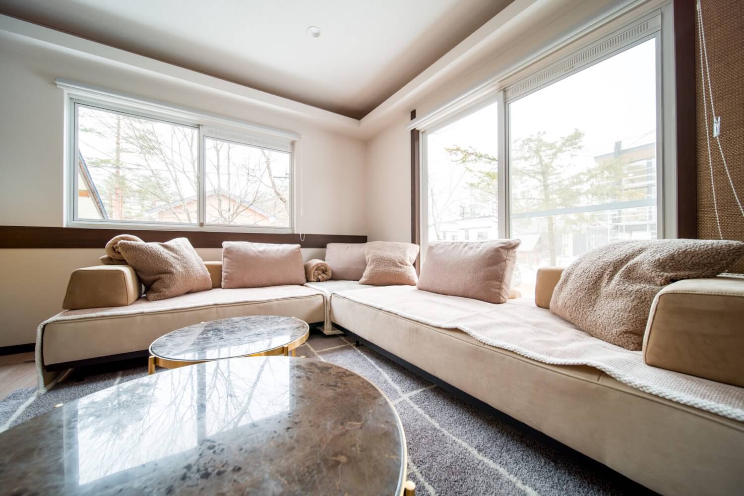 The living room is beautifully furnished with modern sofas and dining for everyone to relax, and a couple of breakfast stool at the kitchen counter.